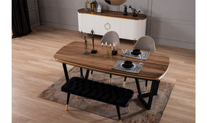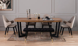 | Dining table | The top is made of MDF material with wood veneer. The table top does not have a center opening feature. The legs are made of metal. |